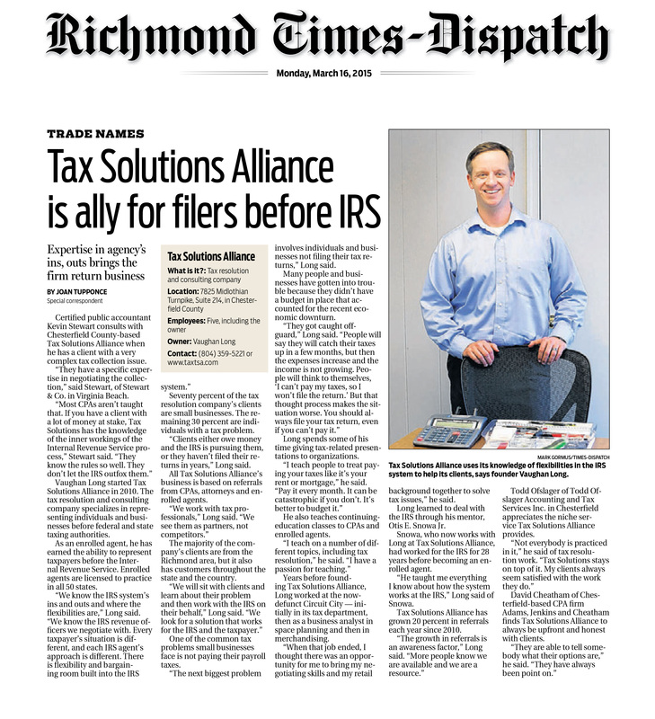 Tax Solutions Alliance Vaughan Long interviewed by Richmond Times-Dispatch